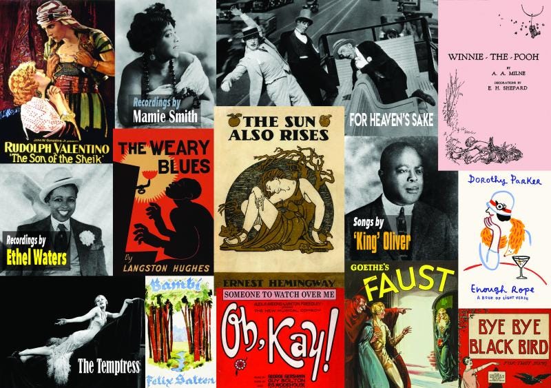 Asta înseamnă că le poți folosi cum crezi de cuviință: le poți copia, distribui, modifica, utiliza drept coloană sonoră la conținutul propriu. De la 1 ianuarie, au devenit de asemenea libere de copyright și o serie de filme de epocă cu Harold Lloyd, Buster Keaton, Rudolph Valentino sau Greta Garbo, dar și cărți pe care oricine le poate reedita acum fără obligații, cum sunt titluri de Agatha Christie, William Faulkner sau Ernest Hemingway. Lista e aici.