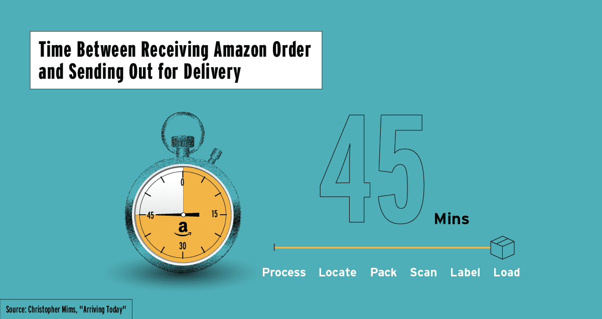 45 de minute. Atât durează până când marfa pe care ai comandat-o pe Amazon este culeasă de pe raft și pornește spre tine. Asta înseamnă procesarea comenzii, ambalarea, scanarea și etichetarea pachetului înainte ca acesta să plece la drum. 1 din 153 de lucrători americani este angajat al Amazon.