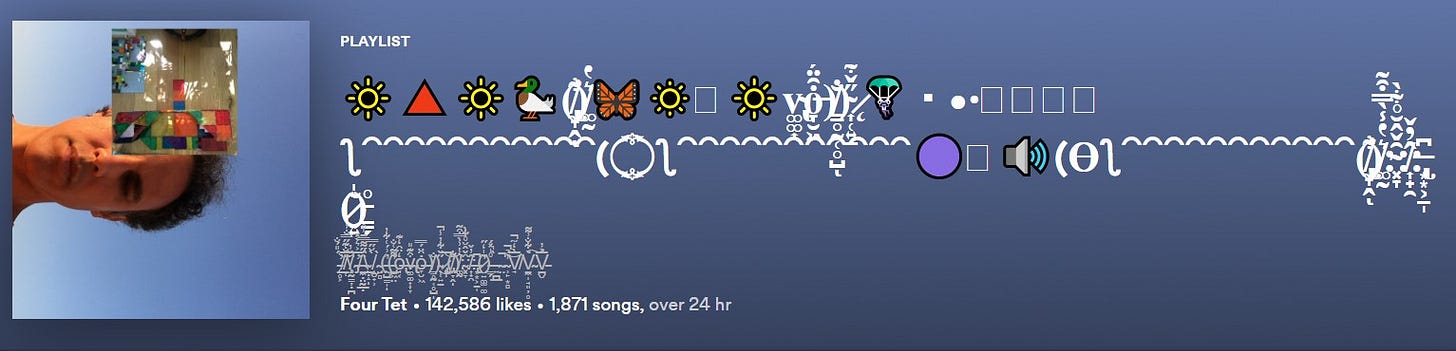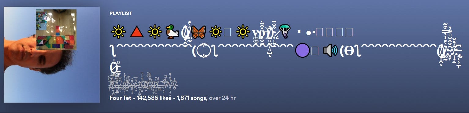 În acestă poză vezi titlul, alcătuit din emoticoane și alte caractere simbolice, ale unui playlist Spotify cu durata de 155 de ore, cuprinzând aproape 1900 de piese, definite drept o colecție de „inspirații auditive și efemeride”.