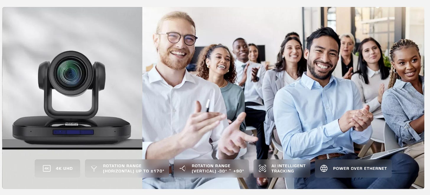 Are un câmp de vizualizare larg – plus că se rotește cu până la 170 de grade orizontal și cu până la 90 de grade vertical -, claritate excepțională, la rezoluție 4K UHD. Captează imagini cu un senzor Sony și beneficiază de un algoritm AI care urmărește și încadrează automat vorbitorii pentru o prezentare profesională. Camera PTZ 4K Alpha oferă o varietate de opțiuni de interfață care facilitează conectarea simplă și fără complicații, Plug&Play, la cele mai noi dispozitive, datorită gamei generoase de porturi Ethernet, USB, HDMI și 3G-SDI.