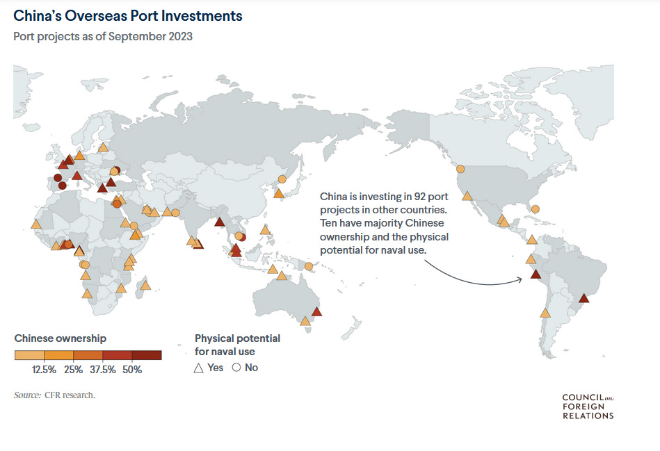 Aprope 95% din comerțul internațional al Chinei se desfășoară pe mare, astfel încât statul asiatic are o politică perseverentă de investiții în porturile străine. (cfr.org)