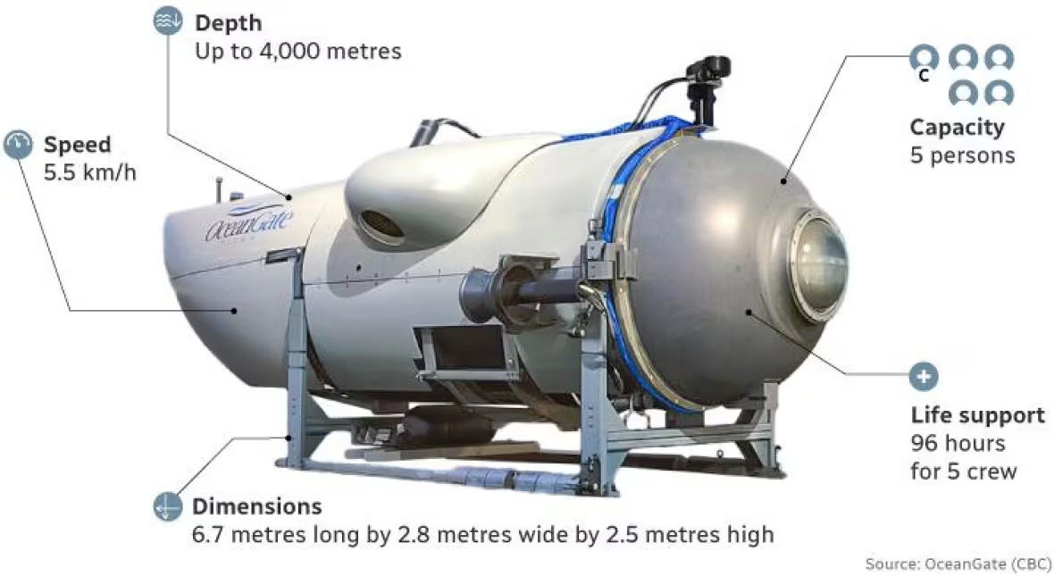 Submersibilul Titan. Proiectul de submersibil revoluționar Titan urma să creeze un nou tip de turism – vizite în adâncul oceanelor. Compania creată în acest scop, OceanGate, fusese avertizată că submarinul experimental s-ar putea să nu reziste la presiunea enormă, de sute de atmosfere, din adâncuri. Cu toate acestea, cinci persoane s-au urcat la bord pentru a vizita epava Titanicului, aflată la 3500 de metri adâncime.