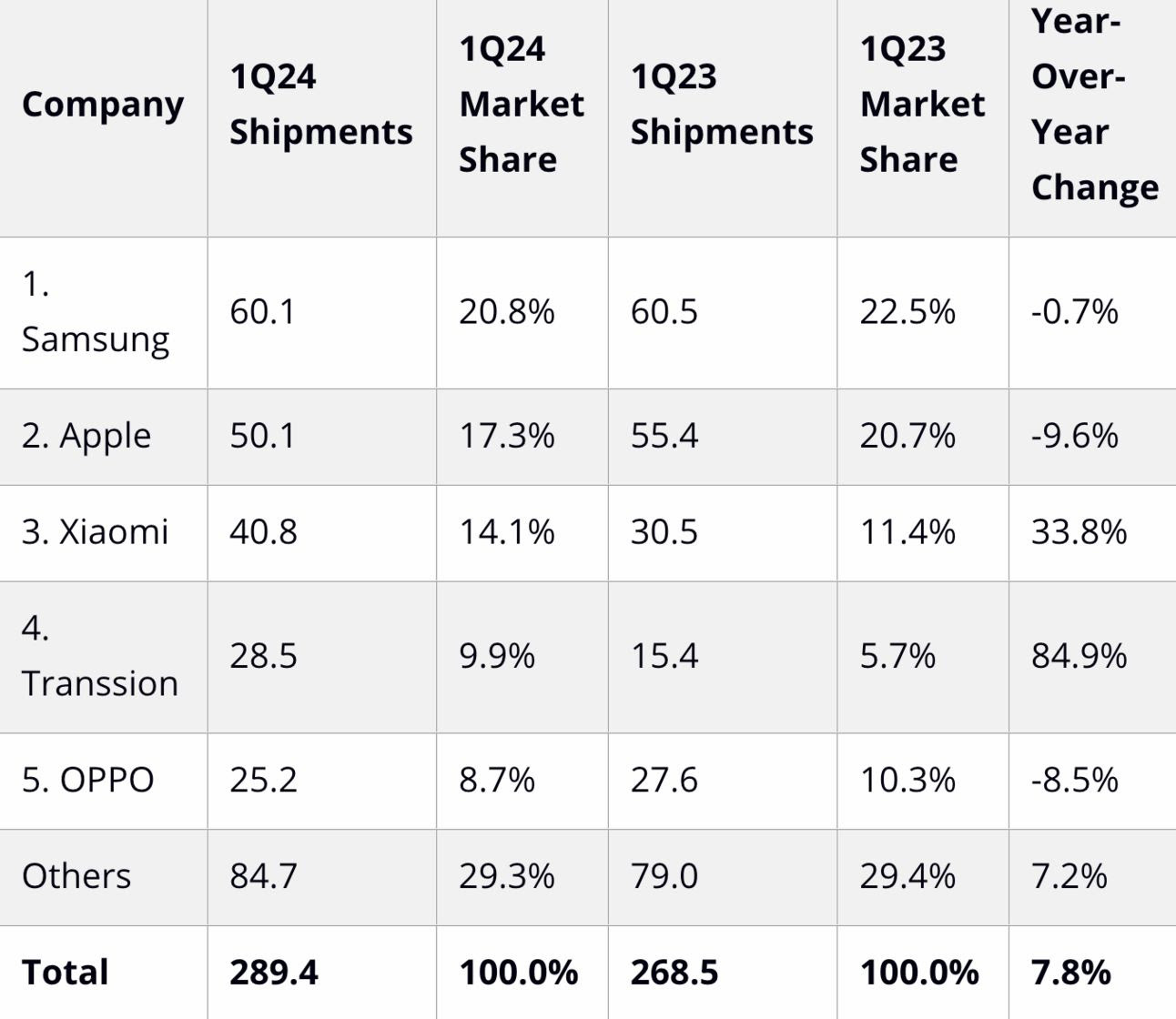 Livrările globale de smartphone-uri au crescut cu 7,8%. Samsung recuperează primul loc în top de la Apple