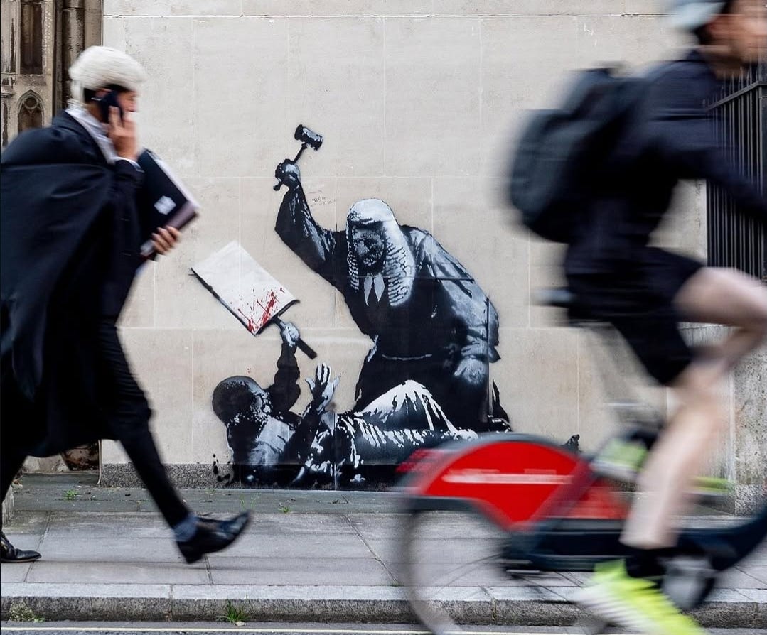 Graffiti de Banksy pe peretele Royal Courts of Justice din Londra. Artist urban și militant antisistem, britanicul Banksy a reușit să rămână anonim și misterios de aproape un sfert de secol, ceea ce constituie un ingredient esențial al notorietății sale.