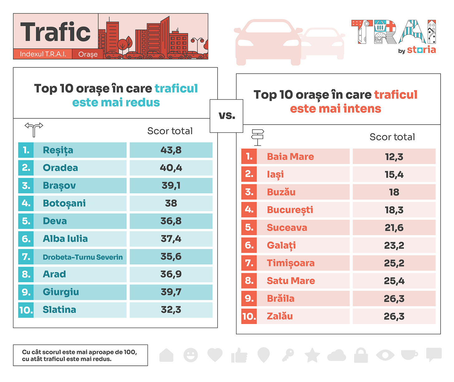 În prezent, Reșița, Oradea, Brașov, Botoșani și Deva sunt orașele din România cu traficul rutier cel mai redus, în timp ce la polul opus se află Baia Mare, Iași, Buzău, București și Suceava, unde traficul este cel mai intens.