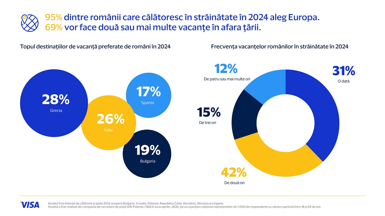 Anul acesta, 37% dintre români plănuiesc să plece în vacanță peste hotare, iar cea mai populară destinație aleasă este Grecia. În timpul celei mai lungi vacanțe în străinătate, 1 din 3 români intenționează să cheltuiască între 201 – 600 de euro de persoană, iar peste 83% dintre români spun că vor plăti cu cardul, telefonul sau ceasul inteligent la destinație. De asemenea, aproximativ 3 din 10 români (28%) vor alege plățile mobile în vacanță, potrivit rezultatelor studiului Visa „Intenții de călătorie și plată 2024”, realizat pe șapte piețe din Europa Centrală și de Est (ECE), inclusiv România.