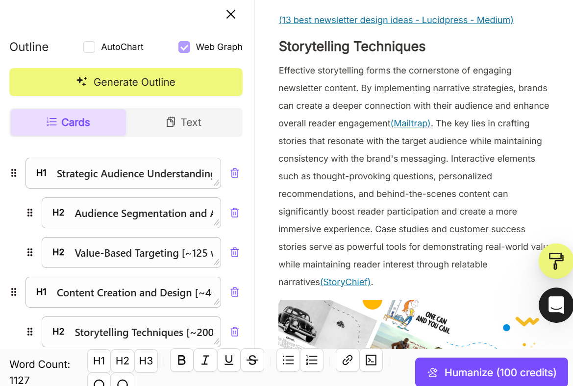 Eu i-am dat ca temă „how to write a successful brand newsletter” și, în câteva minute, mi-a afișat un articol generos ca informație și dimensiune.