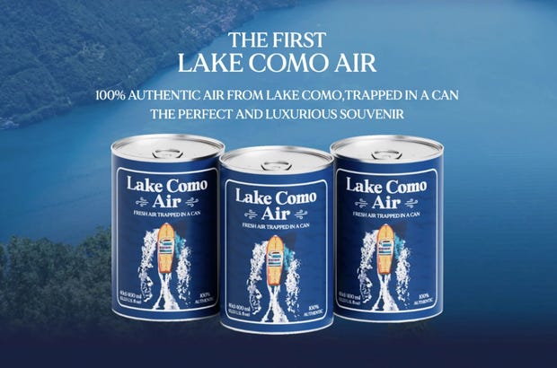 Turism. Întreprinzători din zona celebrului lac italian Como vând aer la conservă cu 9,9 euro bucata, ca suvenir - lumea s-a cam plictisit de magneții de frigider, nu? E o idee italiană mai veche, care s-a răspândit în ultimii 70 de ani în lume. După al doilea război mondial, primul care a aplicat-o a fost un om de afaceri sicilian care vindea soldaților americani eliberatori „aer de Napoli” la conservă.
