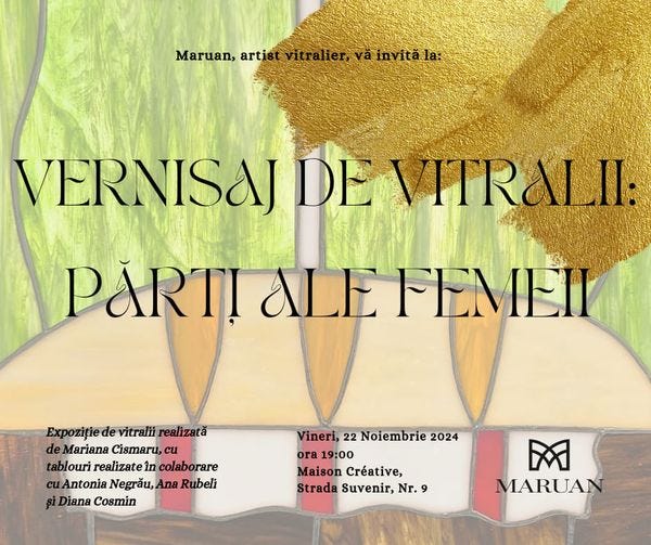 Eveniment. Astăzi, vineri, de la ora 19:00, artistul vitralier Mariana Cismaru ne invită la vernisajul noii sale colecţii de vitralii, Părţi ale femeii. Se întâmplă la Maison Créative (strada Suvenir, nr.9, București).