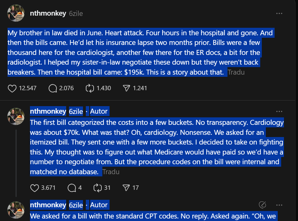 „Cumnatul meu a murit în iunie. Infarct. Patru ore în spital și s-a stins – scrie o utilizatoare threads.com. Asigurarea îi expirase de două luni. A venit factura de la spitalul care îl internase: 195.000 de dolari.