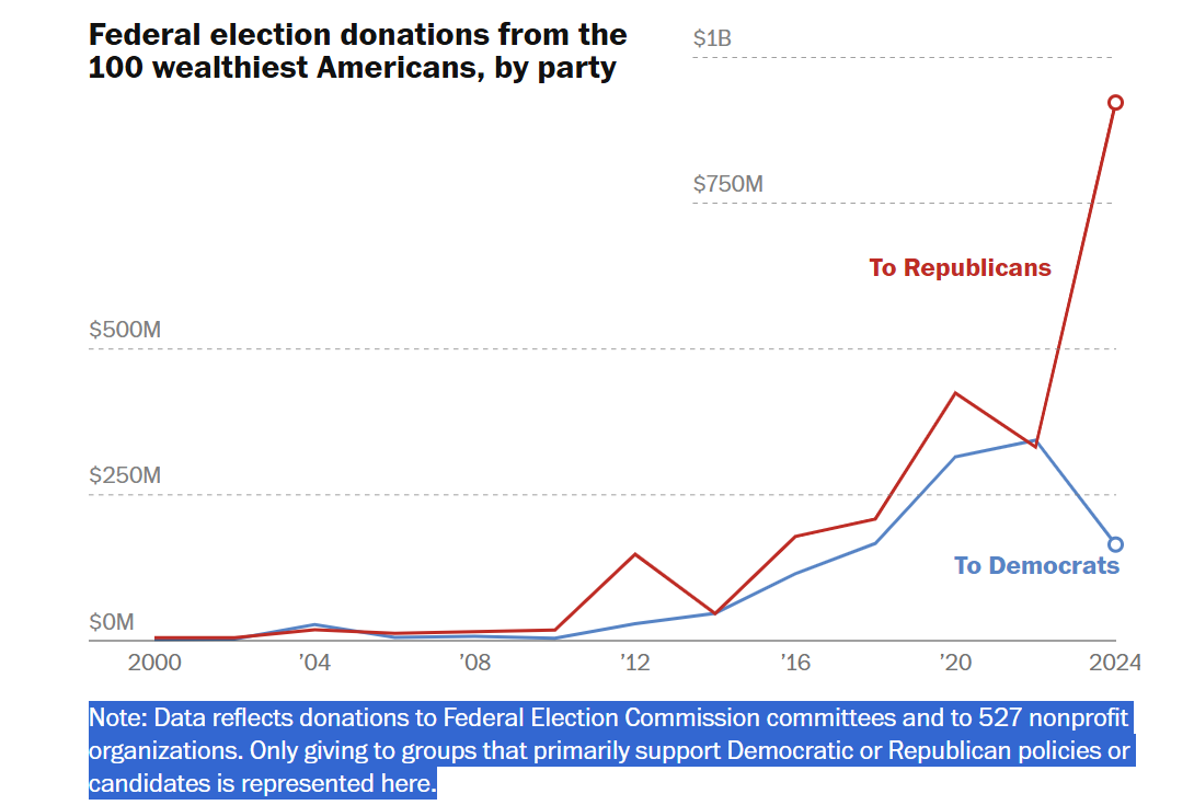 Peste 80% din cheltuielile federale de campanie ale celor mai bogați 100 de americani în 2024 au fost direcționate către republicani.