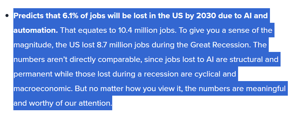 Un recent raport al firmei de cercetare Forrester constată că AI ar putea înlocui doar aproximativ 6% din locurile de muncă (aproximativ 10,4 milioane) din SUA până în 2030.