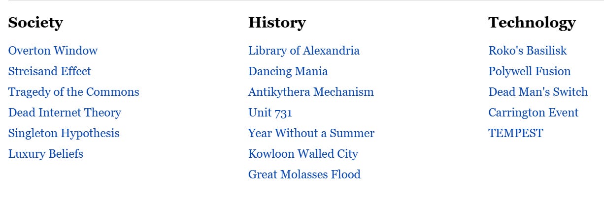 Majoritatea linkurilor trimit către articole de pe Wikipedia, iar selecția este axată pe curiozități, teorii ale conspirației, paradoxuri științifice, fenomene psihologice bizare și evenimente istorice obscure, precum potopul de melasă din Boston, teoria internetului mort sau sindromul Ierusalim.
