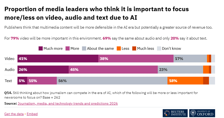 În aceste condiții, companiile media încurajează jurnaliștii să se îndrepte în acest an spre crearea de conținut pentru YouTube, TikTok și Instagram, deoarece clipurile video scurte și concentrate sunt în plină expansiune.