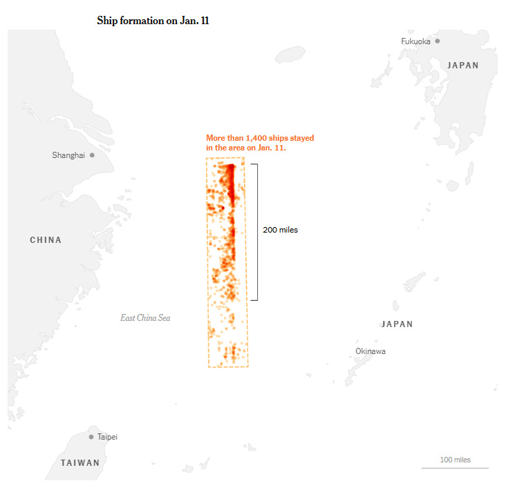 Astfel, săptămâna trecută, aproximativ 1.400 de nave chineze de pescuit și-au întrerupt brusc activitățile obișnuite sau au părăsit porturile de origine și s-au adunat în Marea Chinei de Est. Acestea au format într-un dreptunghi dens care se întindea pe mai mult de 320 de kilometri.