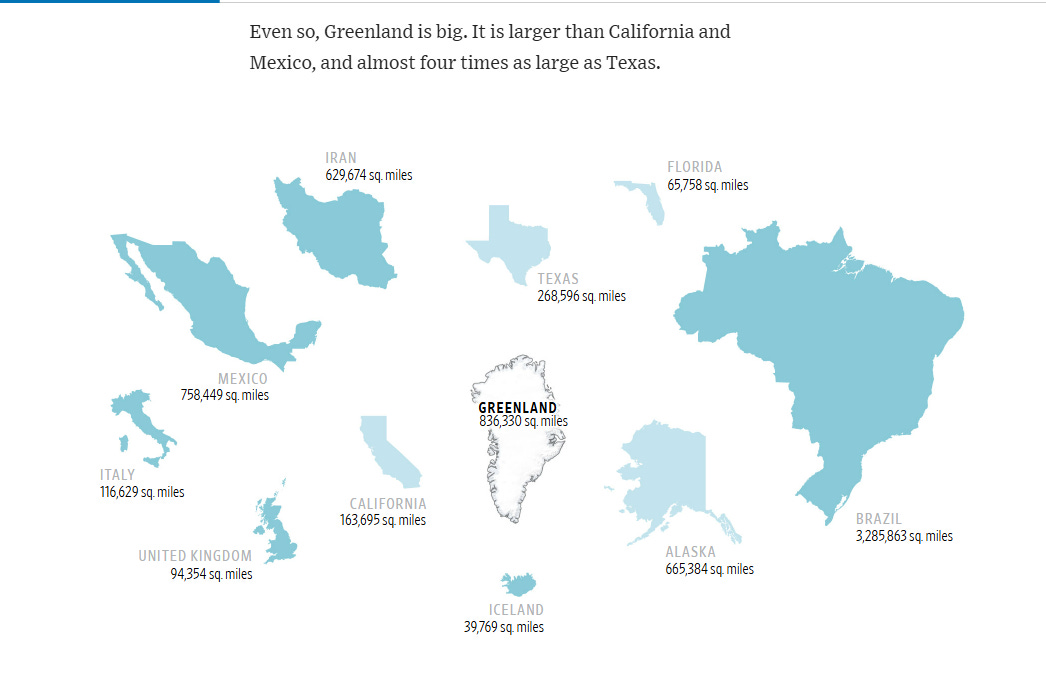 Infografic. WSJ publică șapte hărți sugestive cu Groenlanda, o insulă cu o suprafață mai mare decât Alaska, Iran sau Mexic