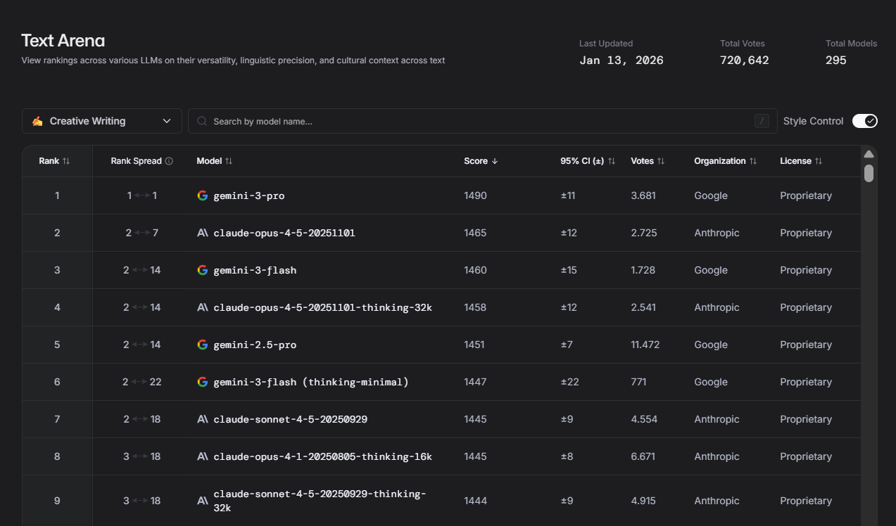 Soluția este să intri pe LMArena Creative Writing Leaderboard, un clasament interactiv al calității textelor livrate de AI, realizat pe baza voturilor în orb a sute de mii de utilizatori obișnuiți. Altfel spus, LMArena este un top, creat de utilizatori, al celor mai bune LLM generative.